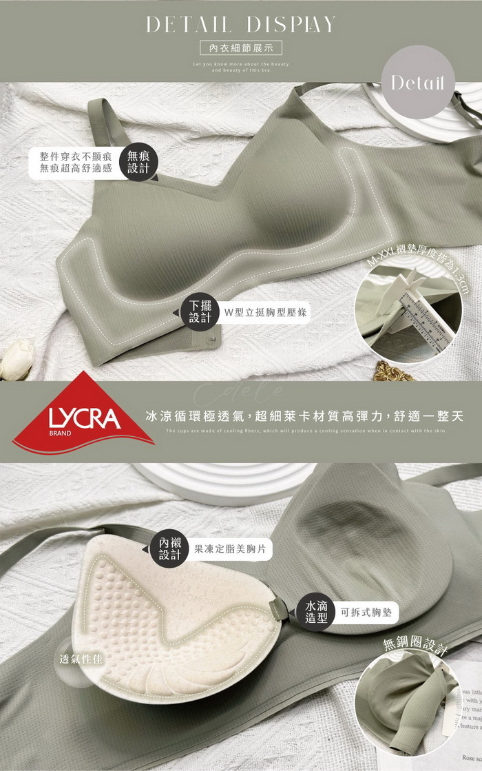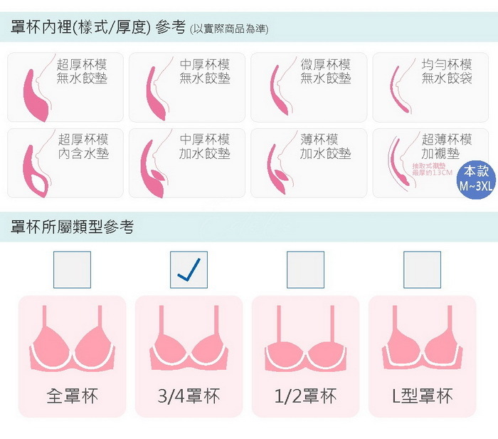 罩杯厚度皆為1.3cm水滴透氣軟Q棉,上薄下厚、集中美型又舒適