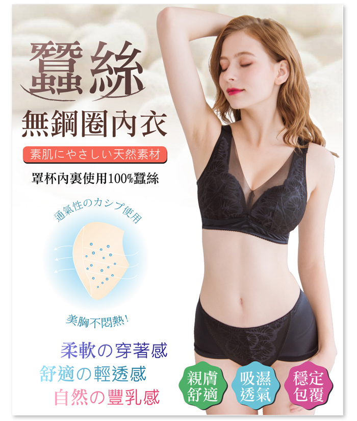 創新添加大自然100%蠶絲面料,進一步增加文胸的透氣性,真正展現會呼吸的調整型內衣