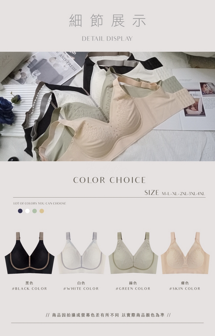 內裡W型布條,穩定支撐胸部提托再往內集中,穿上無鋼圈胸型也能很飽滿