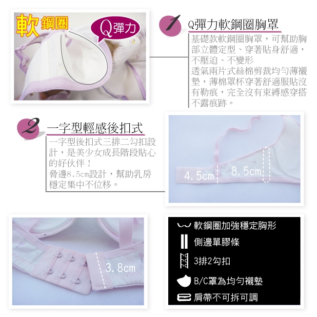 ★一字型後扣式三排二勾扣設計,是美少女成長階段貼心的好伙伴