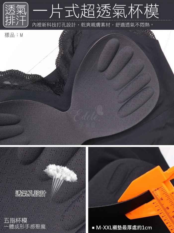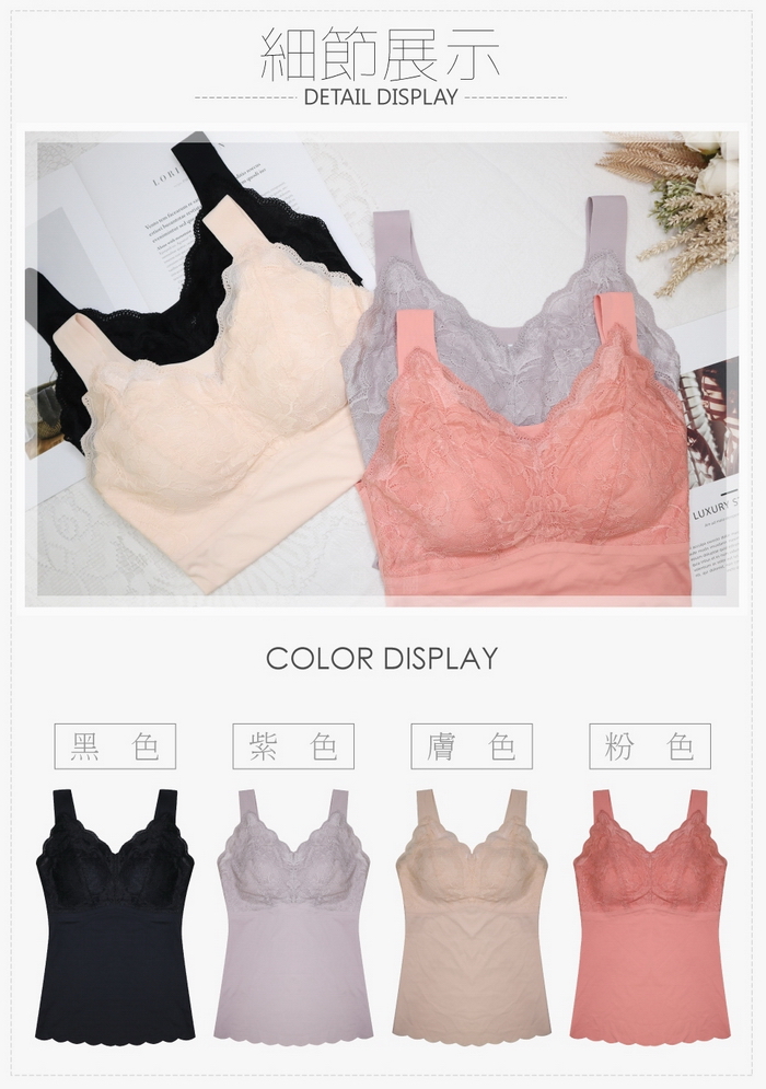 輕薄無鋼圈罩杯背心,一體成形,性感立體蕾絲 內層網布固定,完整包覆防止走光!