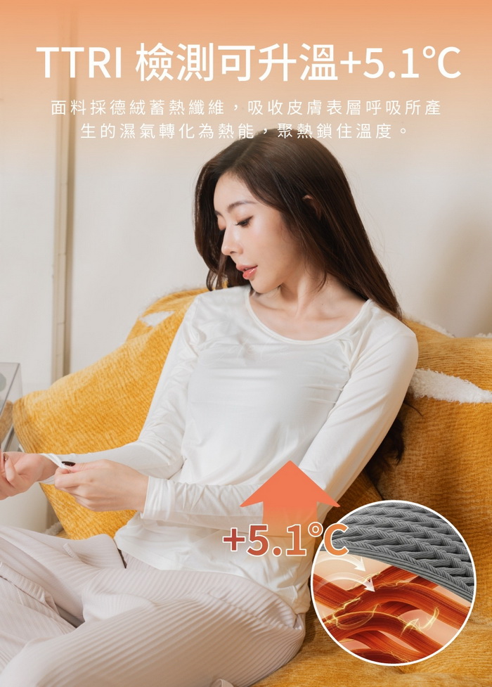 採用德絨蓄熱纖維,吸收皮膚呼吸產生濕氣轉化