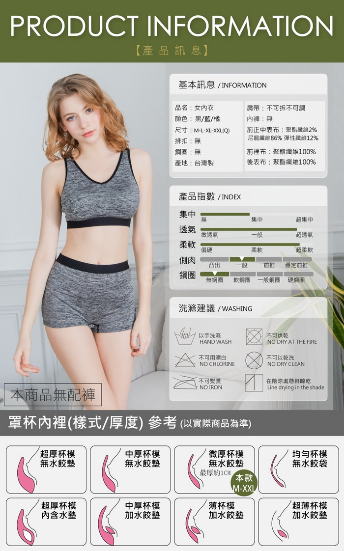 罩杯為上薄下厚一體成型襯墊,設計最厚度約為 1 CM
