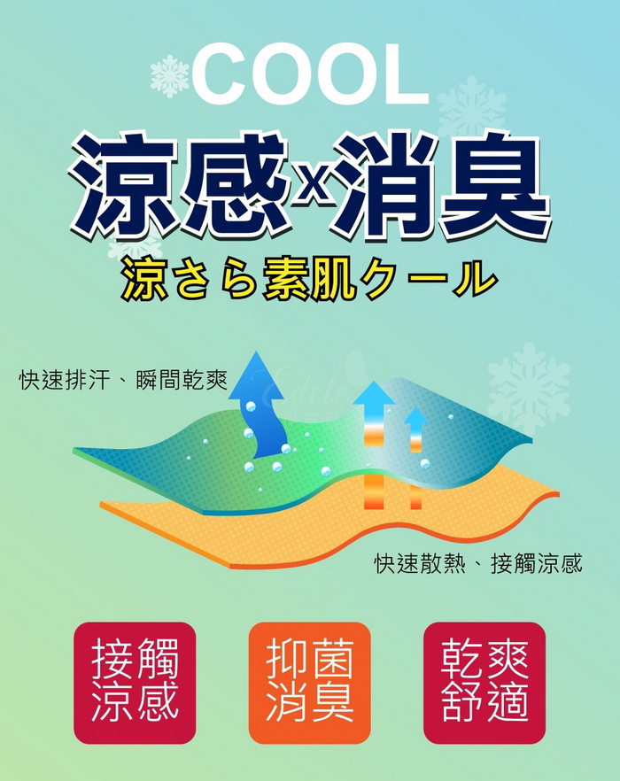 內裡添加COOL涼感X消臭素材,布料清涼乾爽、透氣性佳、