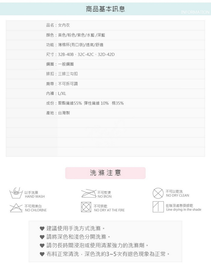 B-D罩杯皆附有QQ襯墊,罩杯為可拆式襯墊,最厚約1.5CM