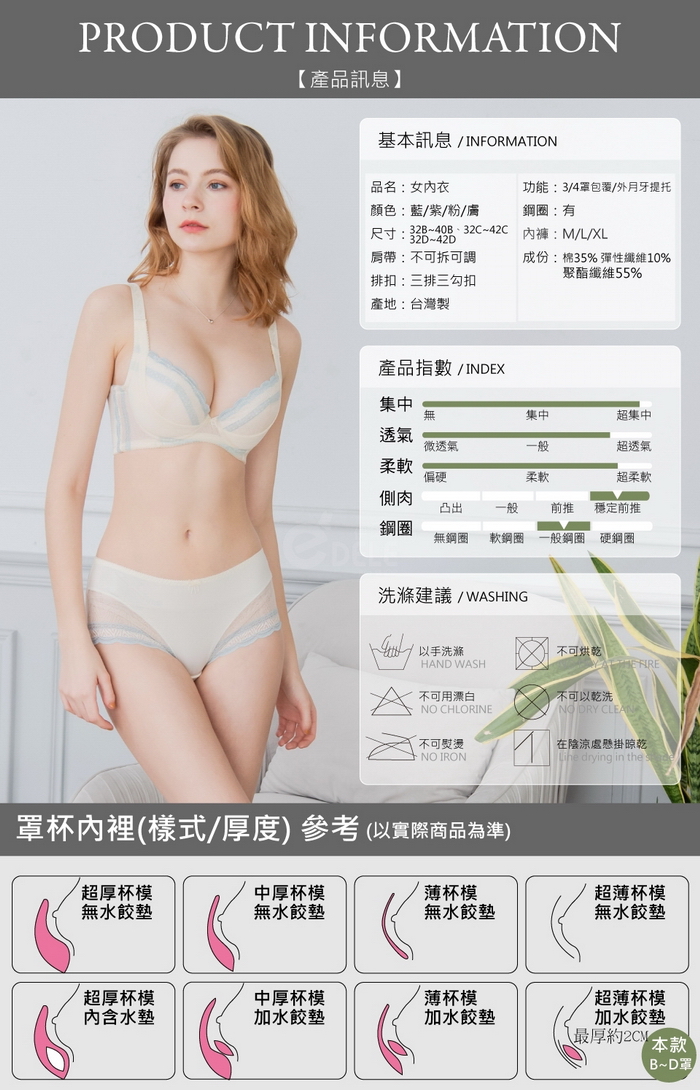 對應夏日穿搭及時尚的外衣線條所設計的3/4罩淺色系內衣,搭配夏日淺色系衣著不尷尬