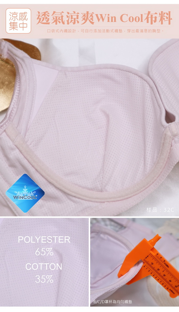 罩杯內襯使用涼爽Win Cool布料,吸濕排汗,穿著乾爽散熱又柔軟