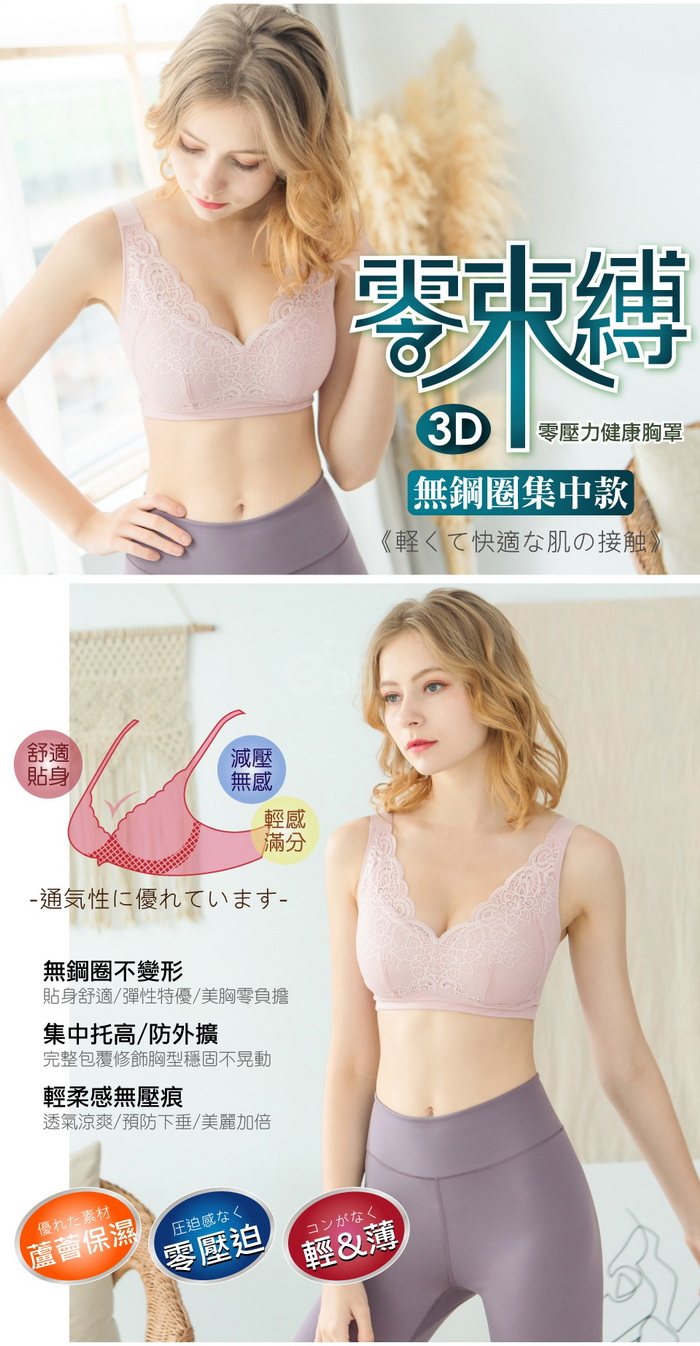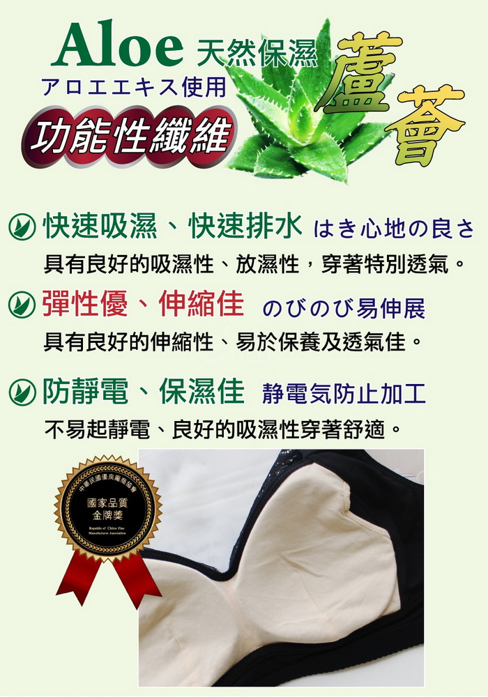 三大特點:無鋼圈/蘆薈保濕纖維/鎖邊布加壓