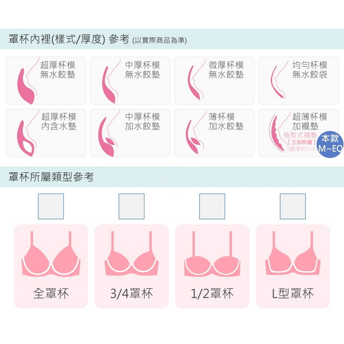 襯墊為可拆式手指型襯墊,完美掌托乳房,集中雙溝