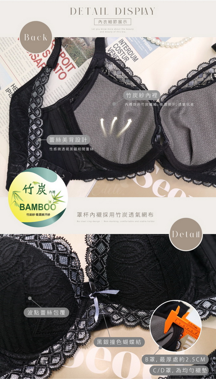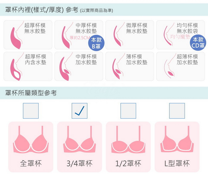 B罩杯為下厚上薄2.5CM,C/D罩杯為均勻襯墊