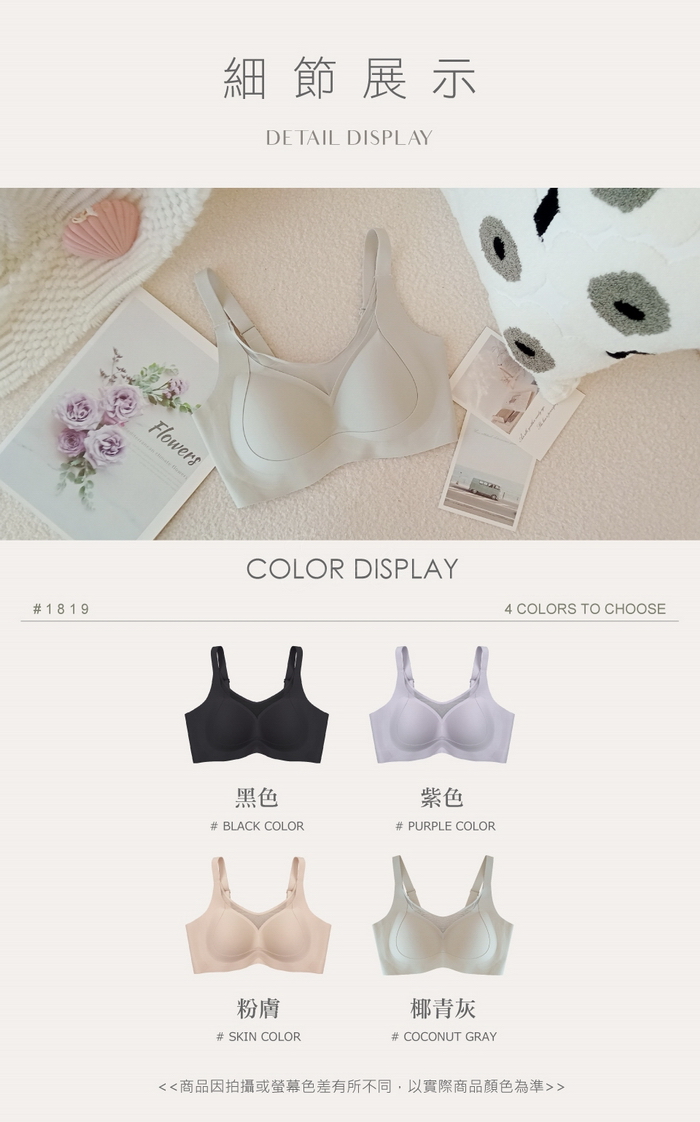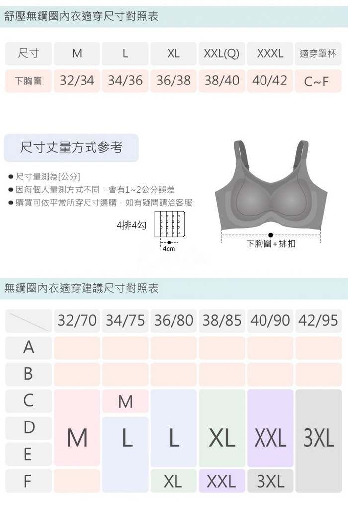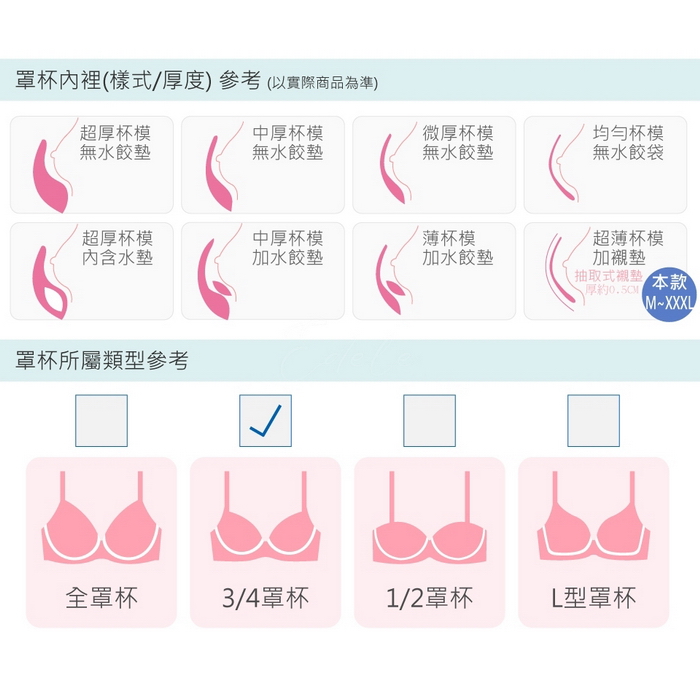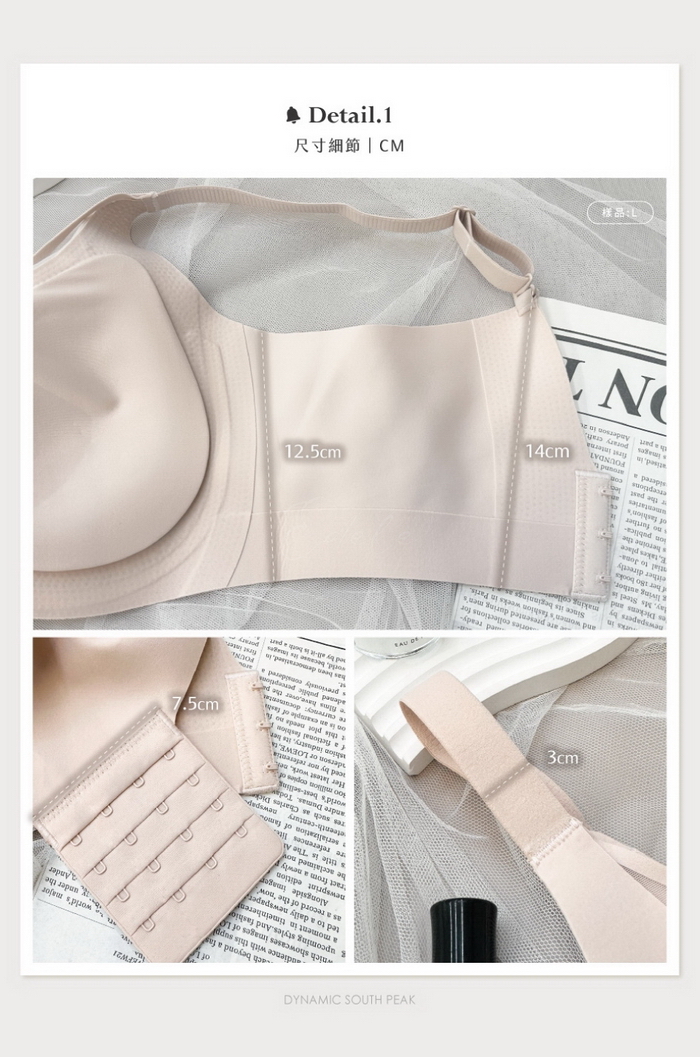 下厚上薄0.5CM厚,將肉肉上推不空杯、四排三勾扣設計可調整穩定後背