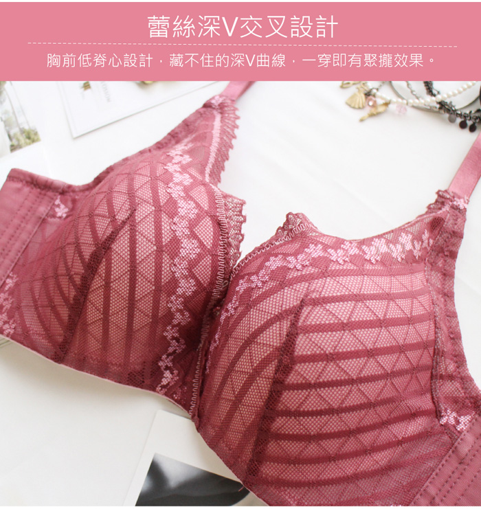 法式精美緋紅花蕊蕾絲 胸前深V性感集中設計