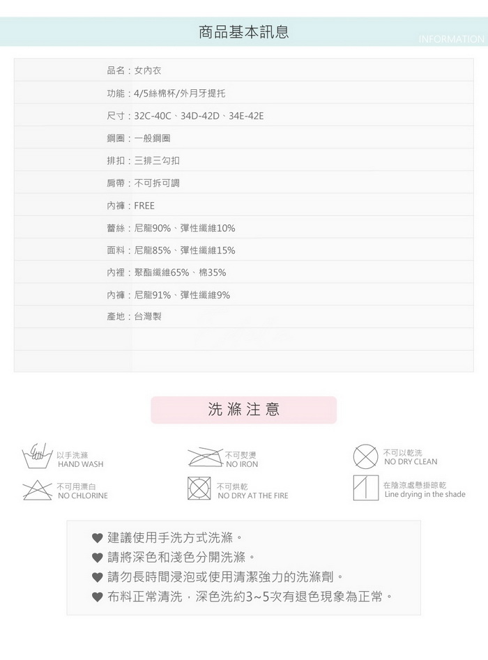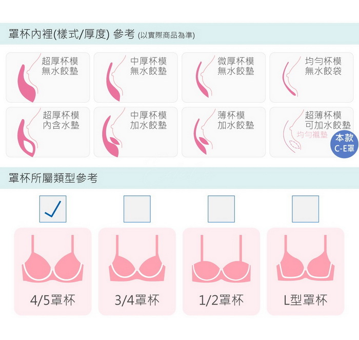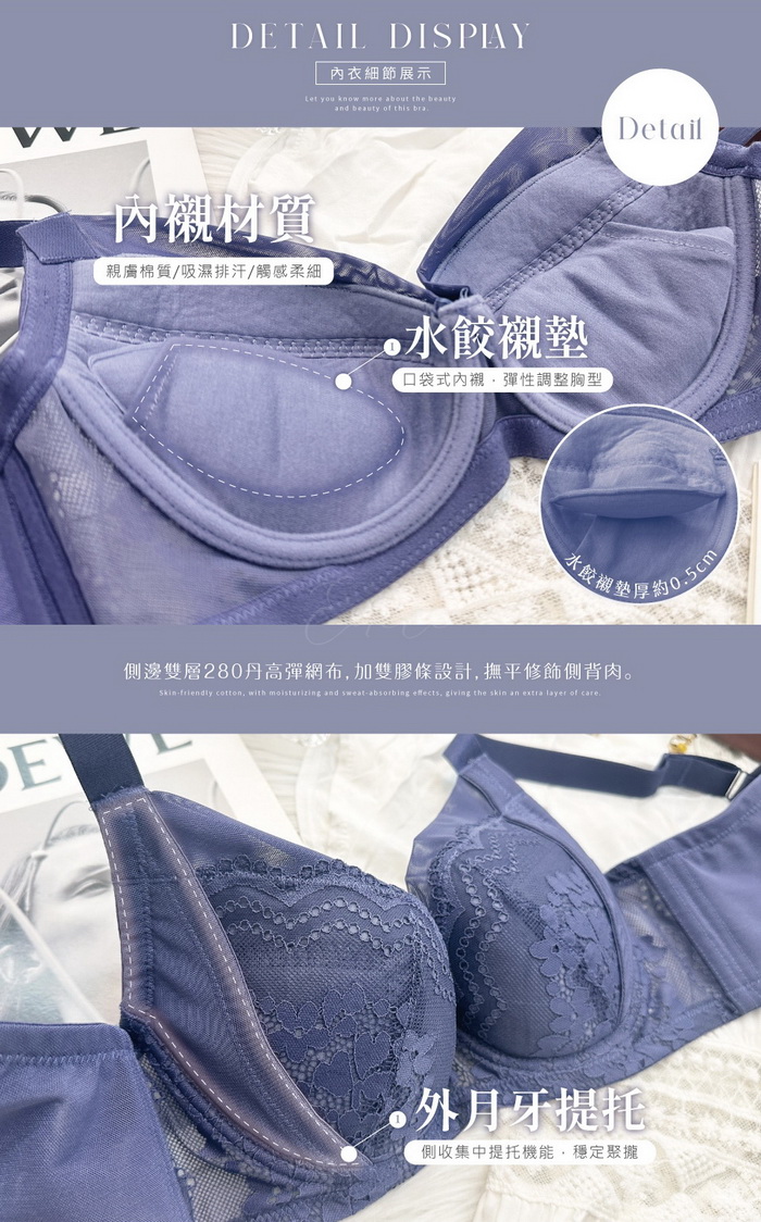 罩杯為4/5絲棉杯加外月牙提托片,側收集中提托機能,胸型更加渾圓立挺