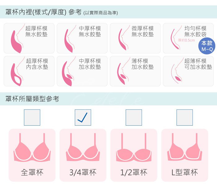 罩杯內襯為半固定式,加深杯模增加胸型穩定度、不跑杯