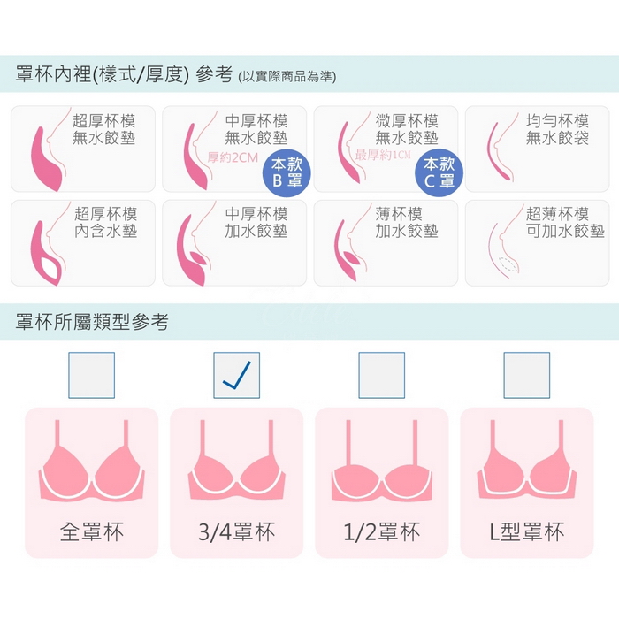 3/4罩造型,P-UP剪接從脅邊集中,營造優美乳溝線條