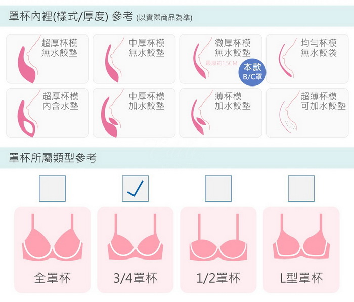 B-C罩皆為下厚上薄襯墊,最厚處約1cm