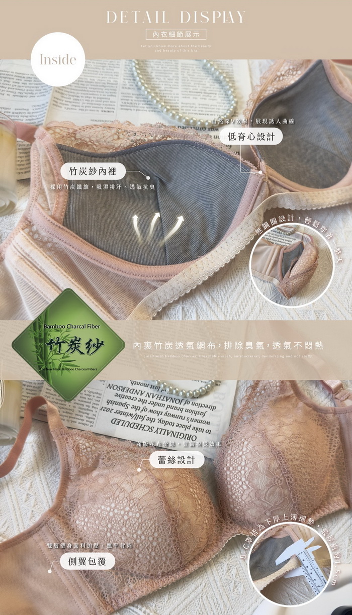 無鋼圈設計,能提高胸型,兩側副乳向內集中靠攏