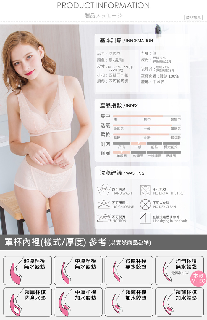 創新添加大自然100%蠶絲面料,進一步增加文胸的透氣性,真正展現會呼吸的調整型內衣