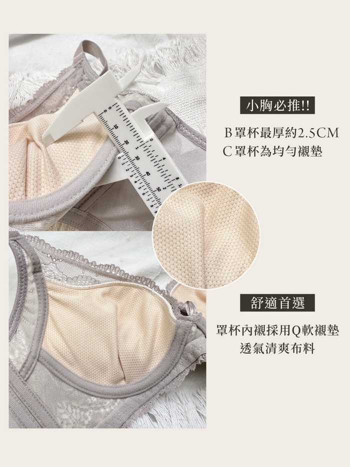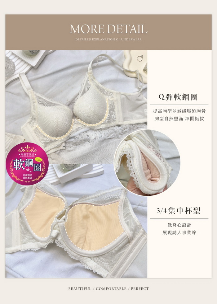 舒適J型軟鋼圈設計,能提高胸型,兩側副乳向內集中靠攏
