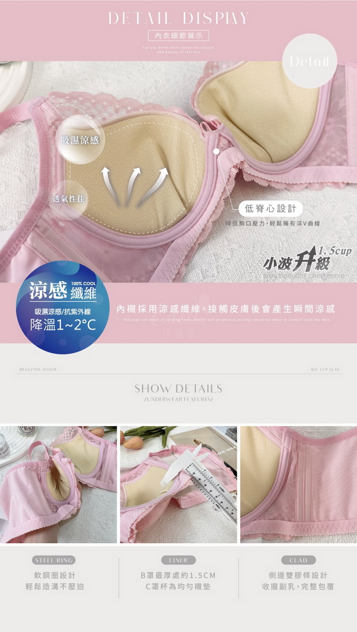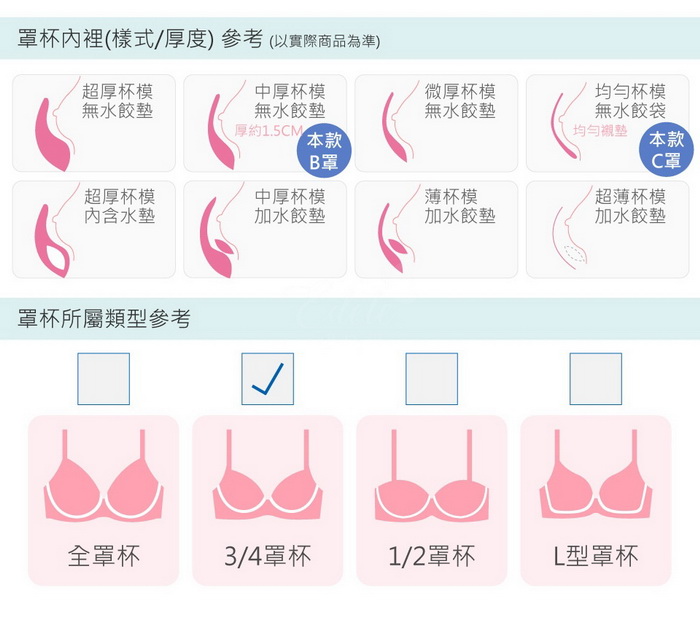 B罩杯上薄下厚,厚度約1.5CM、C罩杯是為均勻襯墊