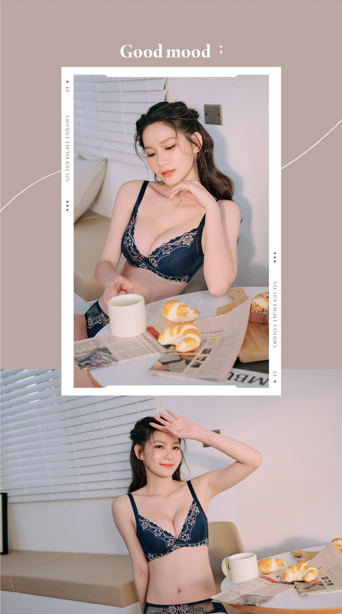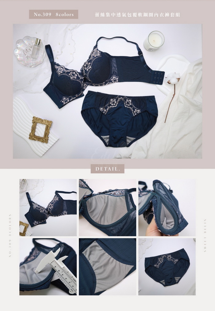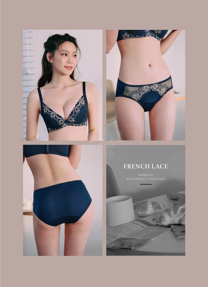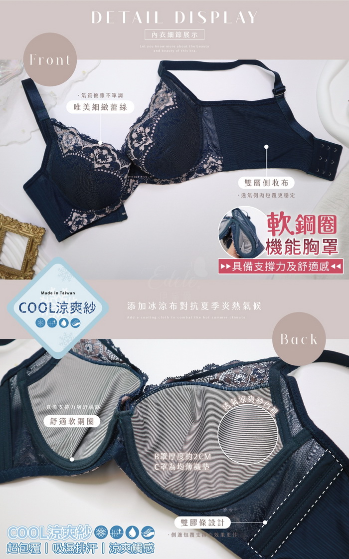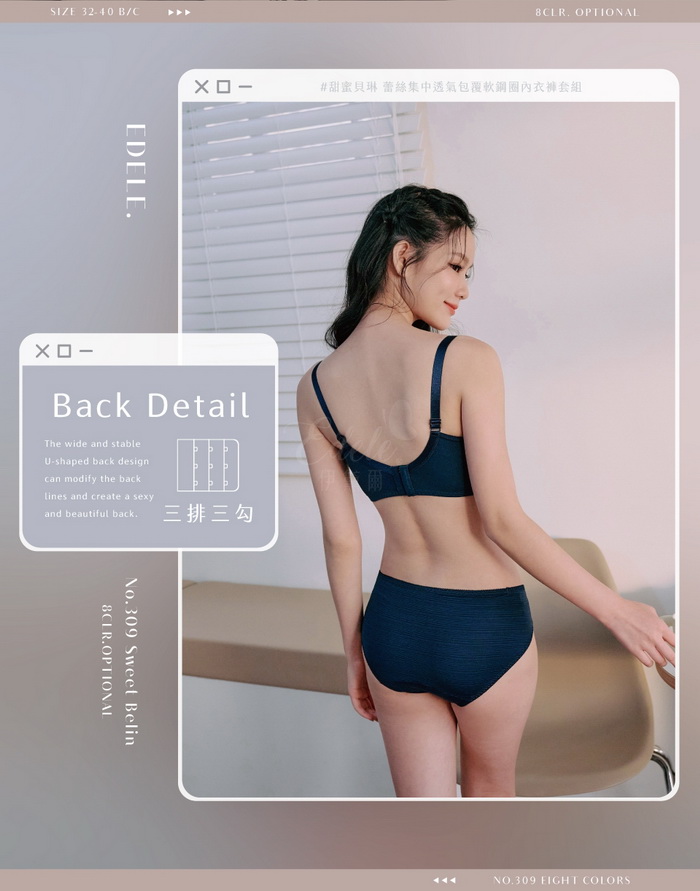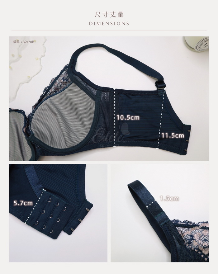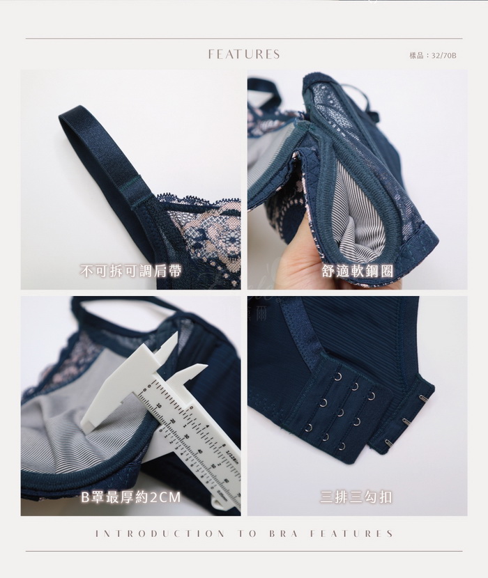 罩杯特別採用輕透精緻彈性緹花蕾絲,利用黃金三角形的剪裁,並搭配小U背造型,打造成時尚美背