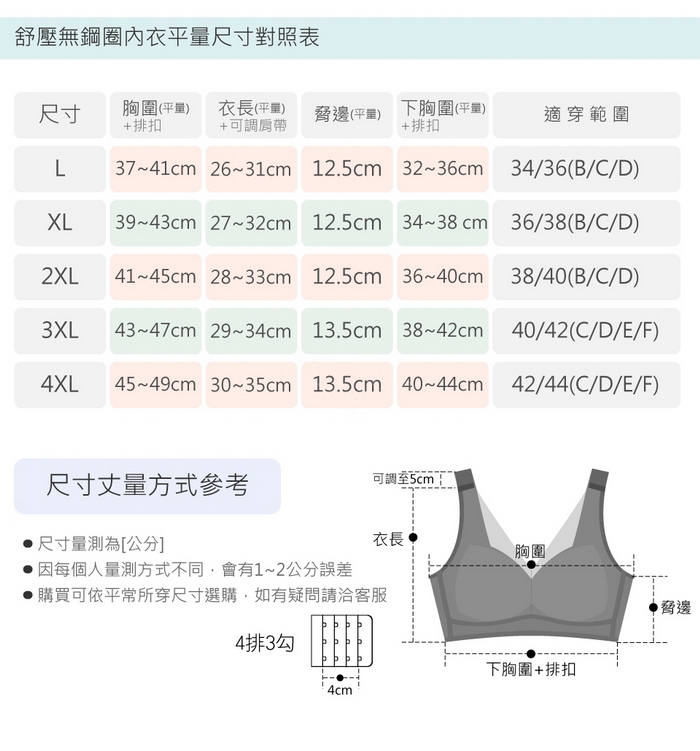 L、XL、2XL、3XL、4XL為抽取式襯墊最厚處約1CM