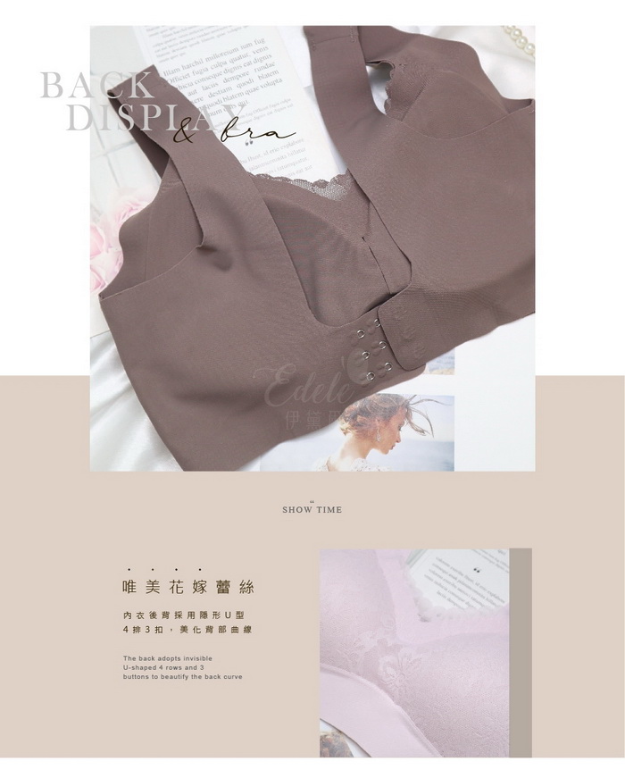 後背採用隱形U型4排3扣,美化背部曲線,並加強內衣調整穩定度