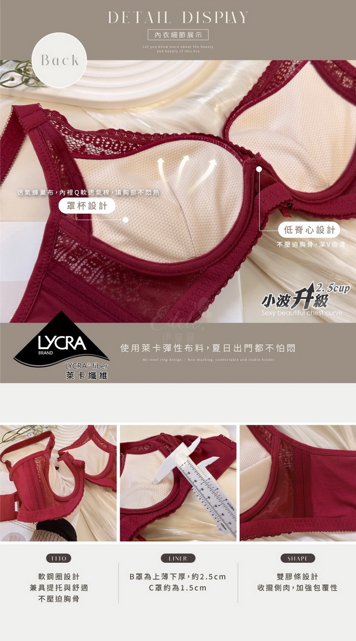 後背為U型美背三排三扣,美化背部曲線,並加強內衣穩定度