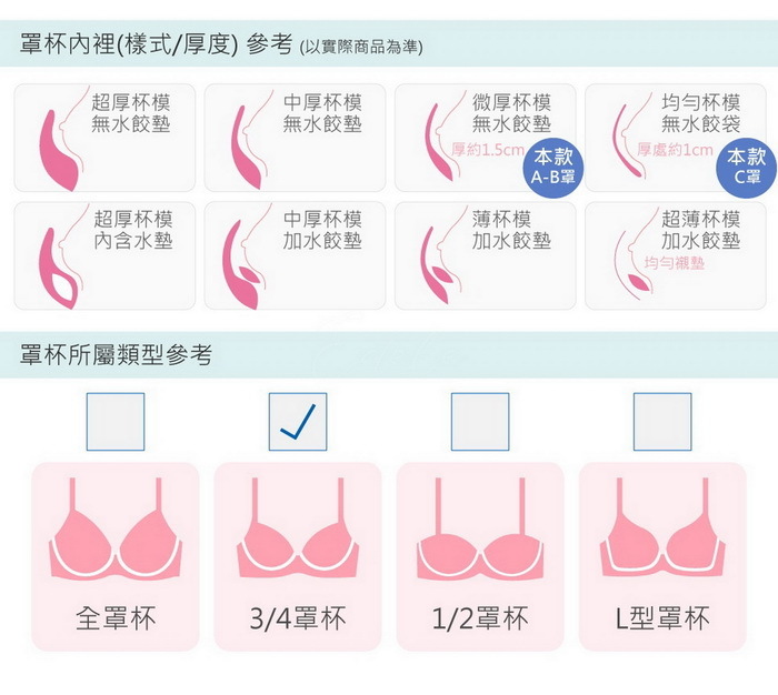 此款為淺杯襯墊,A/B罩杯為下厚上薄1.5CM , C罩杯為1cm