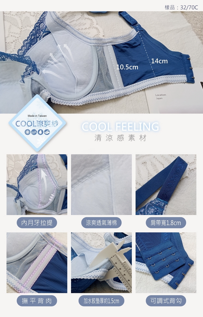 杯模內側無彈棉布,將胸部往上拉提更加集中,舒適呵護胸部肌膚散熱親膚感