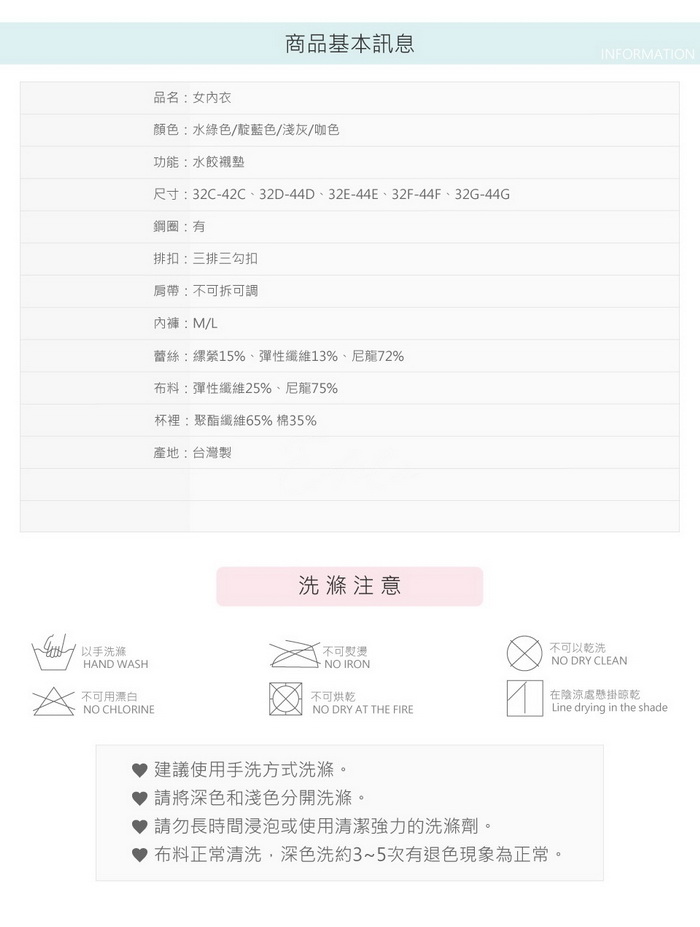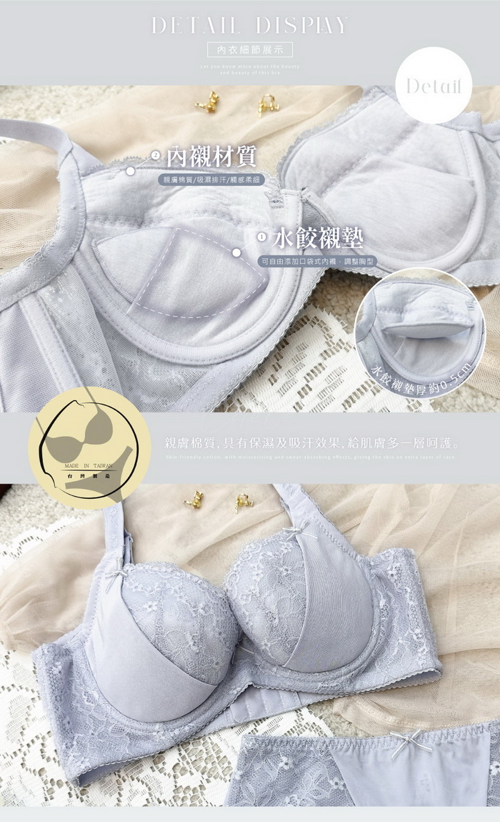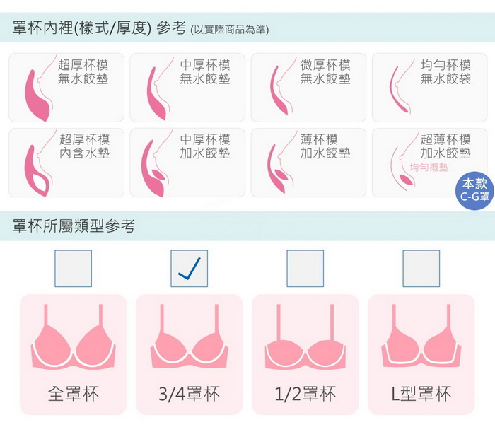 C-G罩杯皆附有可拆式魔術水餃襯墊,厚度約0.5CM