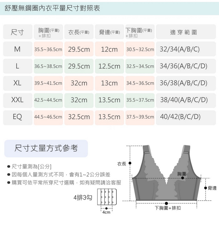 L、XL、XXL、EQ為均勻襯墊; M為下厚上薄1CM