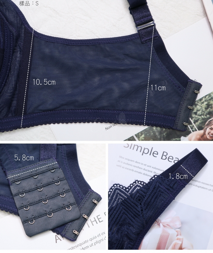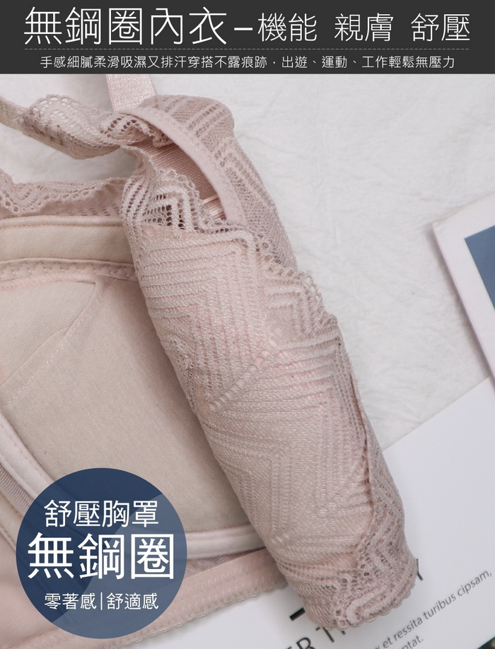 超輕量零重力貼合舒適無鋼圈,舒適絲棉薄罩杯(假袋設計),塑造強、中、弱的功能,達到胸型立體、集中的效果