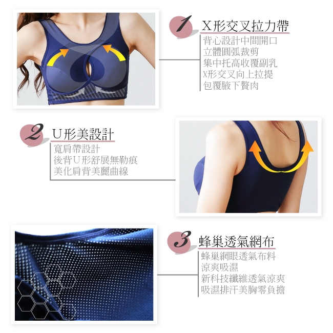 內衣【蜂巢布素材】零束縛無鋼圈運動美胸內衣 *A-E罩 M-XXL(午夜藍)#7309