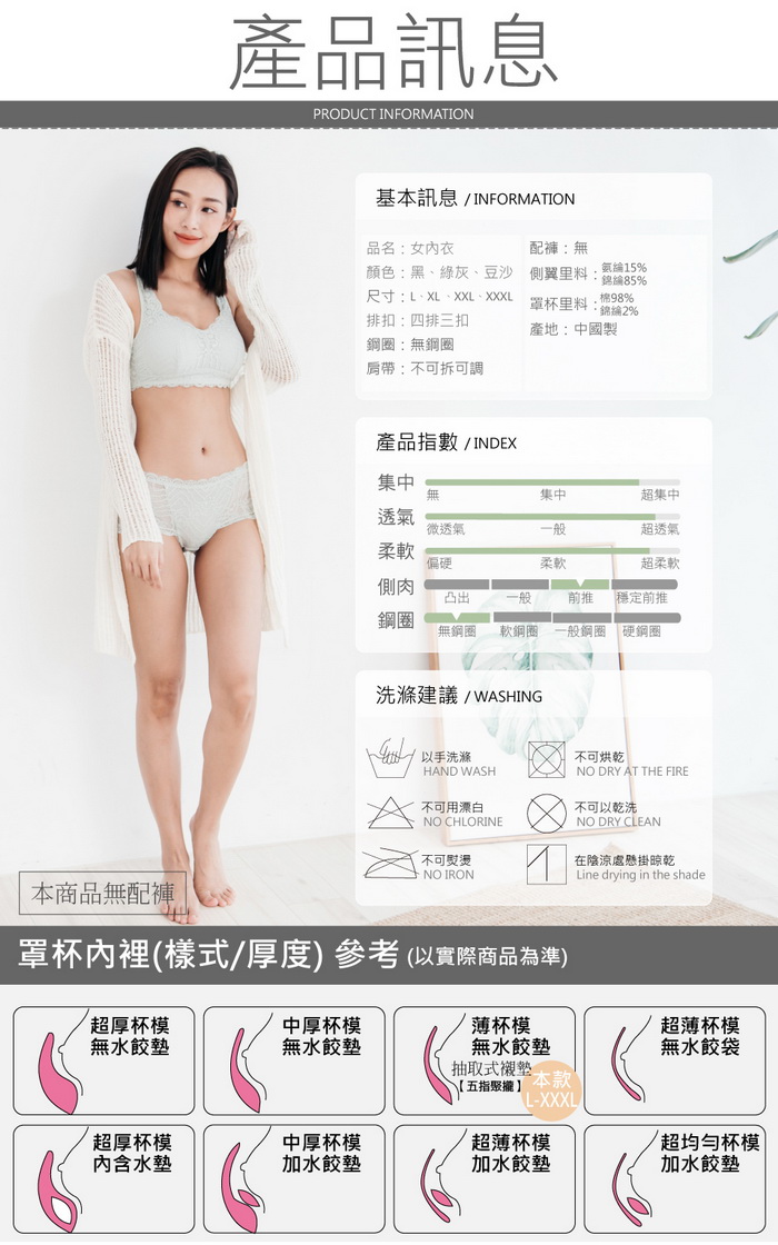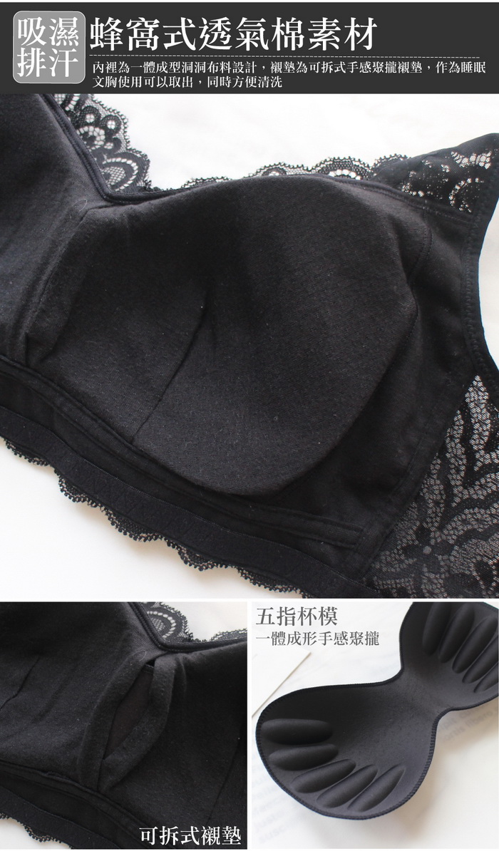 內裡為一體成型洞洞布料設計,襯墊為可拆式手感聚攏襯墊,作為睡眠文胸使用可以取出,同時方便清洗