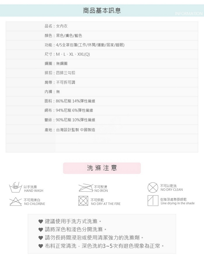 無鋼圈,防外擴設計,立體圓弧裁剪,彈性特優、貼身舒適,穩定集中不變形