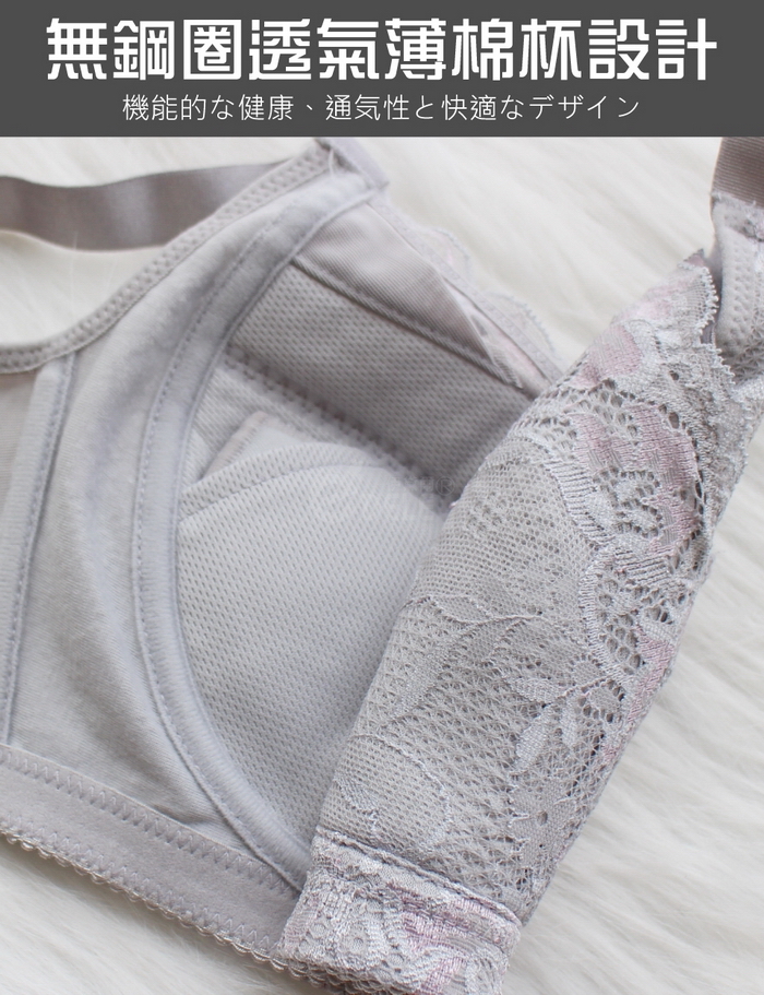 超輕量零重力貼合舒適無鋼圈,舒適絲棉薄罩杯(假袋設計),塑造強、中、弱的功能,達到胸型立體、集中的效果
