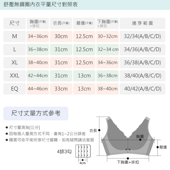 後背採用U型4排3扣,美化背部曲線,並加強內衣穩定