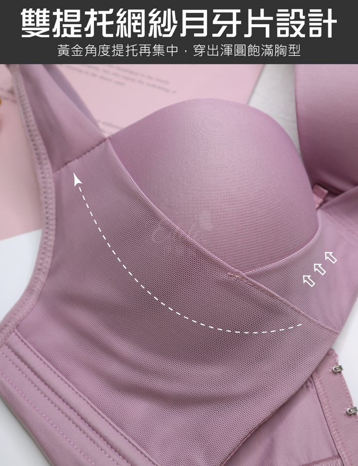 內衣採用無痕布料,搭配雙提托網紗月牙片,黃金角度提托再集中,穿出渾圓飽滿胸型