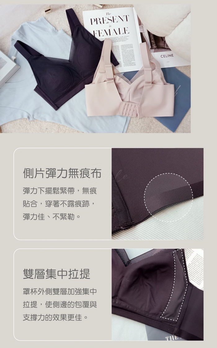 新機能美胸系列,內外雙挺與側、後背的雙重修飾與透氣舒適的設計概念。