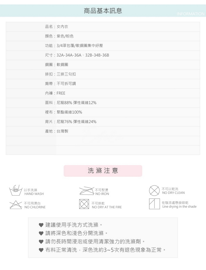 3/4罩造型,P-UP剪接從脅邊集中,營造優美乳溝線條