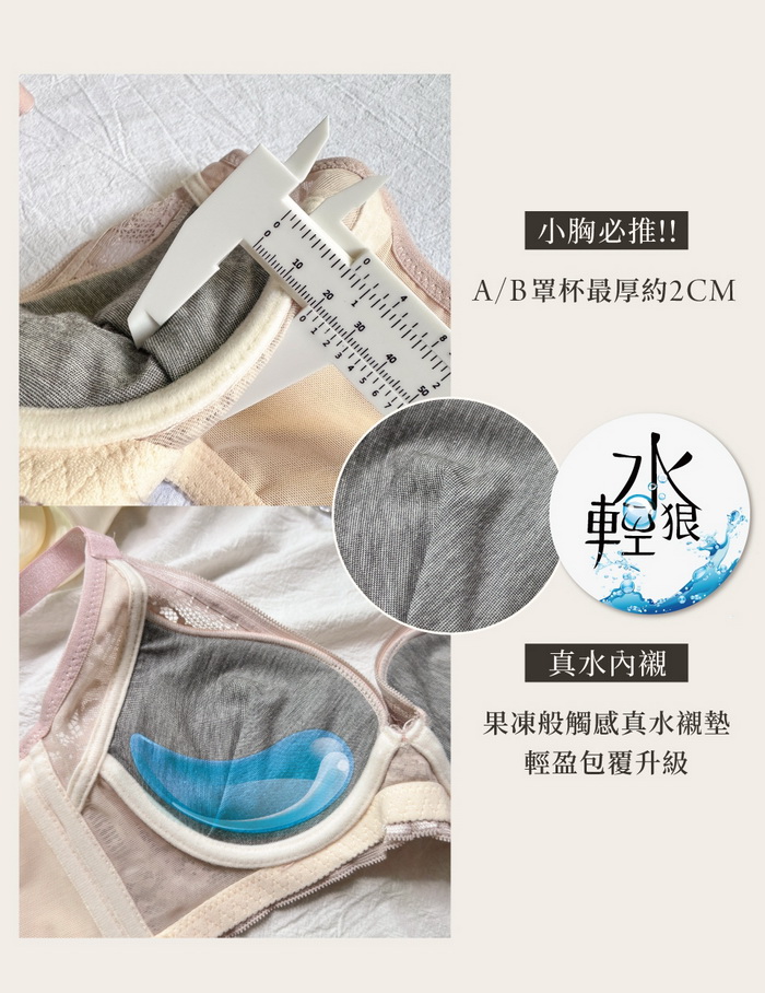 內襯如【果凍】般觸感真水QQ襯墊,柔軟彈性包覆胸型,穿著更加輕盈