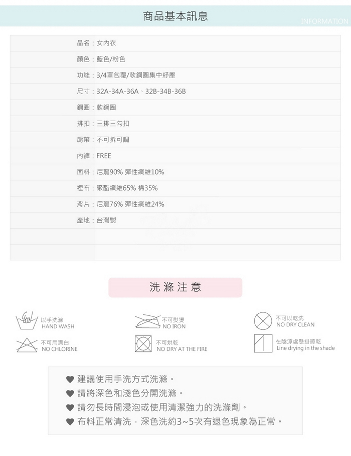3/4罩造型,P-UP剪接從脅邊集中,營造優美乳溝線條