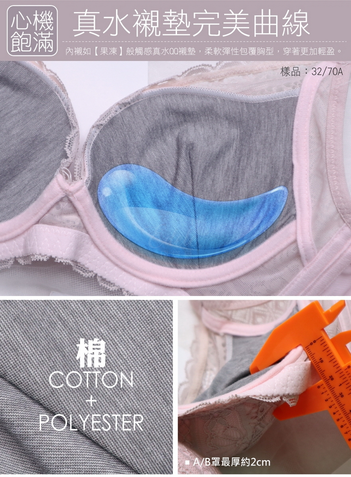 內襯如【果凍】般觸感真水QQ襯墊,柔軟彈性包覆胸型,穿著更加輕盈